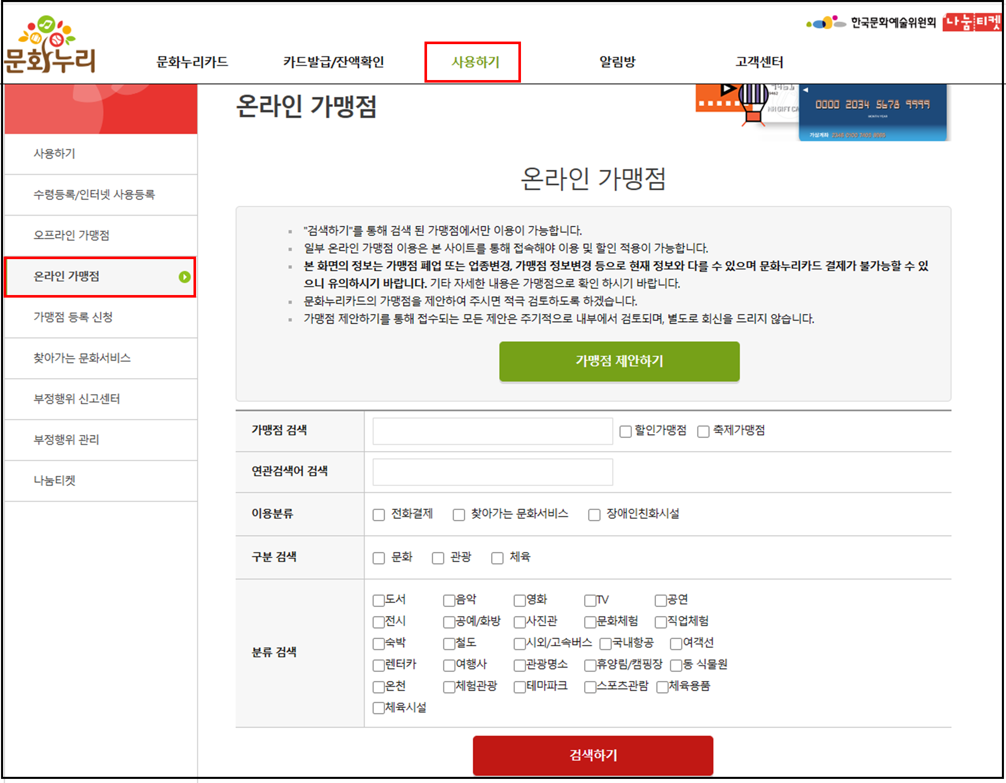 - 문화누리카드는 등록된 가맹점에서만 이용이 가능합니다